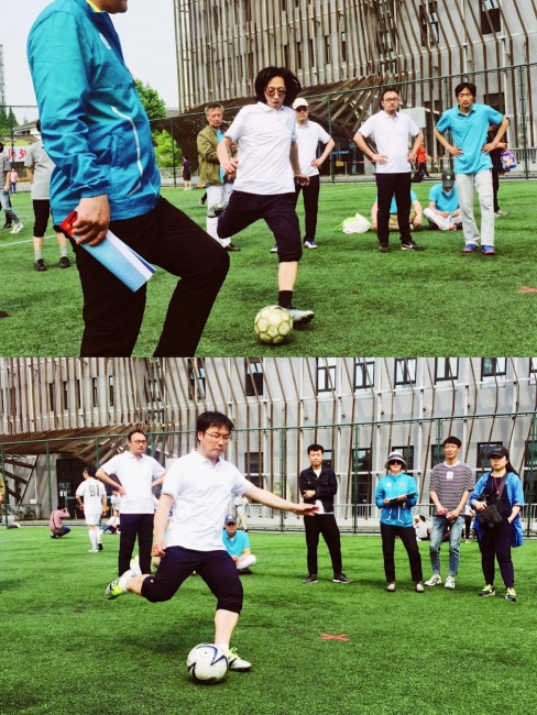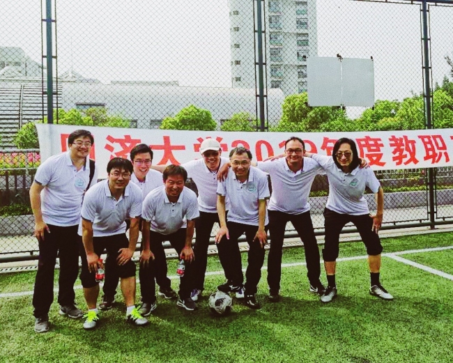 最后是由我们余明锋、樊黎、吴树博、计有恺、李晨五位老师组成的足球组!五位老师穿着白色的运动衫,运用各种姿势朝着那一颗足球奋力踢去,让球在碧绿的草坪上旋转飞驰,最后落入网中。看着合照上五位运动员灿烂的笑容,以及不知为何多出来的其他三位老师爽朗的微笑,不难看出足球竞赛也给他们带来了快乐,在忙碌繁重的工作之余体验着身体的律动以及团队合作带来的兴奋与喜悦~