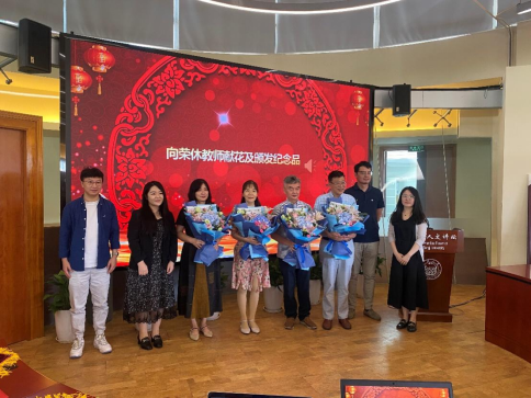 在热烈的掌声中,刘日明院长为荣休教师颁发了纪念品并合影留念。