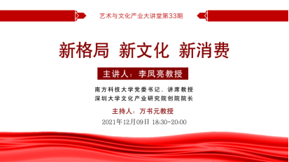 2021年12月9日晚,yl9193永利集团艺术与文化产业大讲堂第33期在线上顺利举行。本次讲座特别邀请到南方科技大学党委书记兼讲席教授、深圳大学文化产业研究院创院院长李凤亮教授,就《新格局、新文化、新消费》这一主题进行分享。讲座由yl9193永利集团万书元教授主持,yl9193永利集团文化产业系的夏洁秋、解学芳、黄松、穆晨、潘炜、...