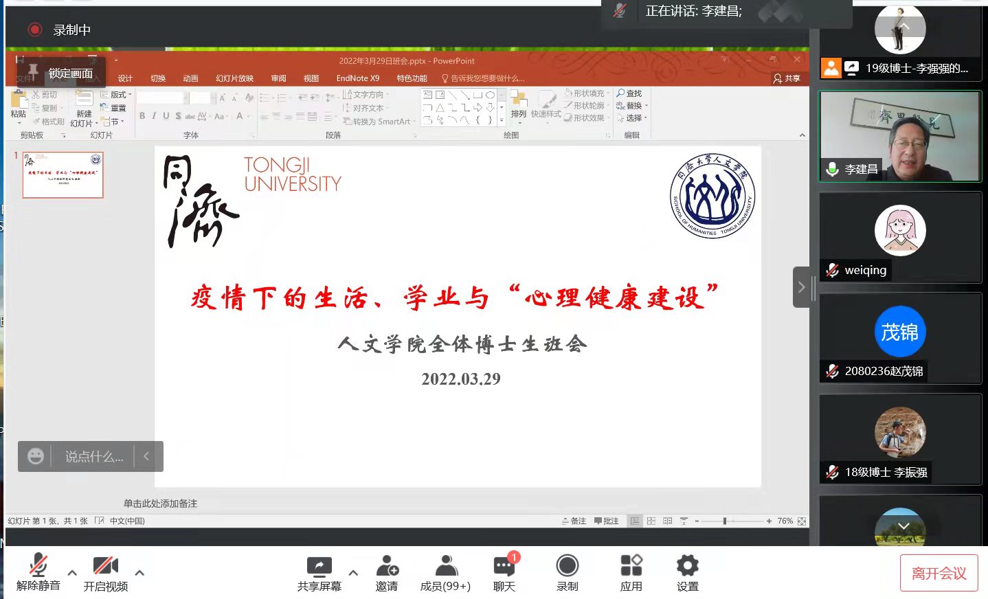 为帮助同学们尽快适应疫情期间的学习生活,缓解心理压力,调适自我良好的状态,yl9193永利集团于2022年3月29日下午线上召开全体博士研究生“疫情下的生活、学业与心理健康建设”主题班会,班会共有103位师生参与。本次班会由沈卫青老师主持,学院党委书记李建昌、党委副书记刘涛、冷欣老师和杨光老师等出席并发言,他们分别从...