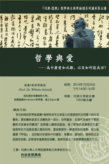 『同濟-復興』儒學與古典學論壇系列講座第五講 主講人:威廉·施密特教授 (Prof. Dr. Wilhelm Schmid) ,任教於德國埃爾福特大學,曾獲德國Meckatzer哲學獎,瑞士Egner獎 題目:哲學與愛——為什麼愛如此難,以及如何...