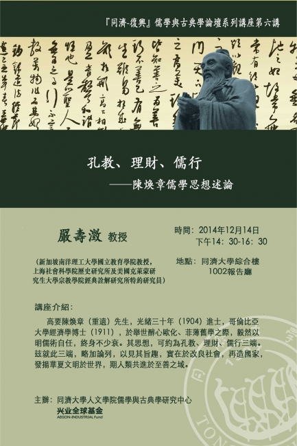 『同濟-復興』儒學與古典學論壇系列講座第六講 題目:孔教、理財、儒行——陳煥章儒學思想述論 主講人:嚴壽澂教授(新加坡南洋理工大學國立教育學院教授,上海社會科學院歷史研究所及美國克萊蒙研究生大學宗教學院經...